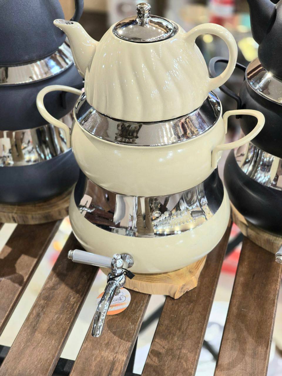 کتری با ظرفیت ۵/۵ لیتر، گزینهای ایدهآل برای خانوادههای پرجمعیت یا محیطهای کاری است. کف چدنی آن باعث انتقال حرارت یکنواخت میشود و به جوش آمدن سریعتر آب کمک میکند، در حالی که مقاومت بالایی در برابر تغییر شکل در اثر حرارت دارد. قوری سرامیکی ۱ لیتری همراه این ست نیز ضمن حفظ دمای مناسب، طعم طبیعی و خوشعطر چای ایرانی را تضمین میکند.