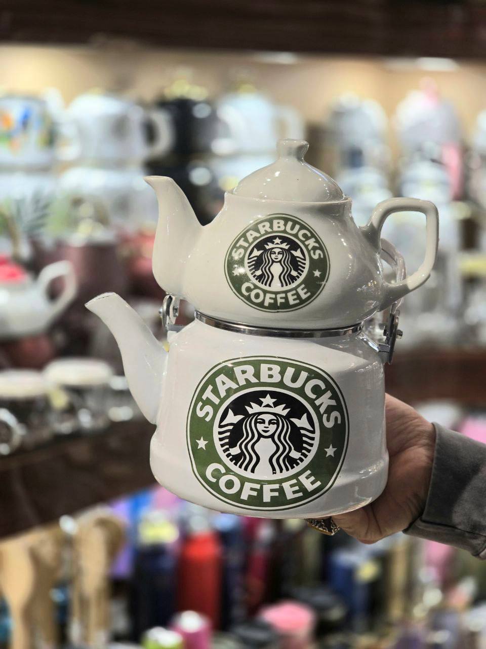 کتری قوری لعابی طرح استارباکس با بدنه لعابی ضخیم، قوری سرامیکی و دسته فلزی مقاوم. حجم کتری ۲.۵ لیتر و قوری ۱ لیتر. ساخت ایران، طراحی خاص و مناسب چای و دمنوش روزانه.