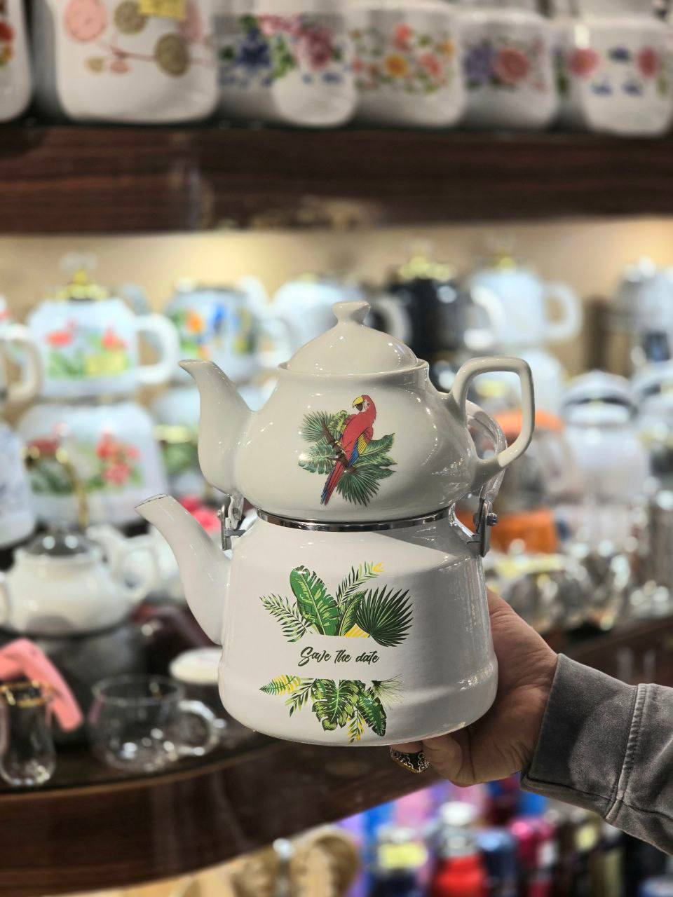 کتری قوری لعابی لوله ای طرح طوطی با رنگهای شاد، بدنه لعابی ضخیم، قوری سرامیکی و دسته فلزی مقاوم. حجم کتری ۲.۵ لیتر و قوری ۱ لیتر. ساخت ایران، زیبا، بادوام و خاص.