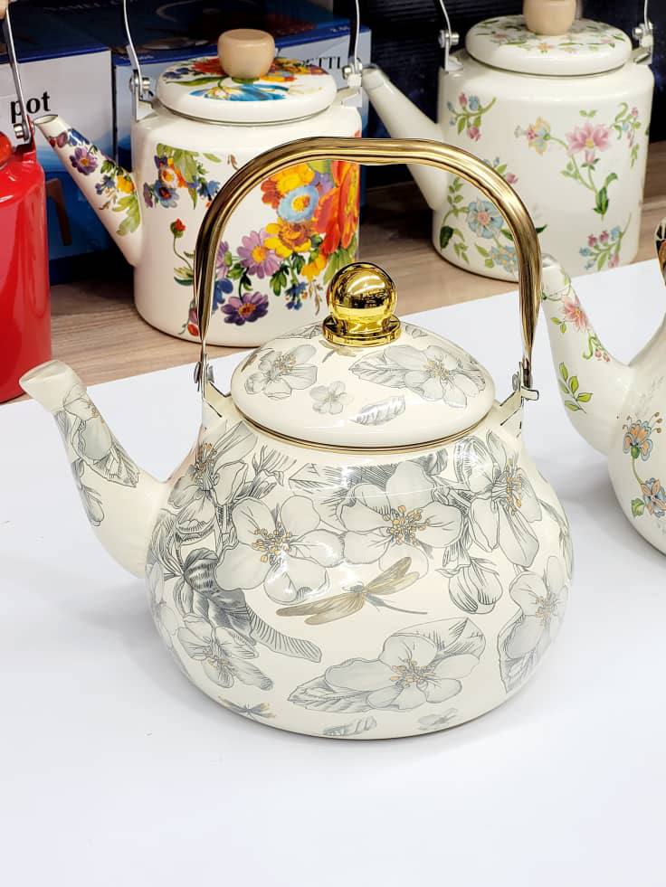 کتری لعابی دسته فلزی سفید گلدار ۲.۵ لیتری با دسته تاشو، طراحی ظریف و لعاب باکیفیت؛ ترکیبی از زیبایی، دوام و کارایی برای آشپزخانهای شیک.
